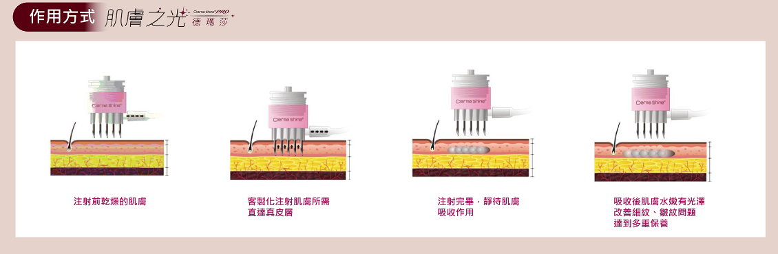 透過專用水光儀器,將玻尿酸、膠原蛋白、肉毒、維他命C等營養成分,