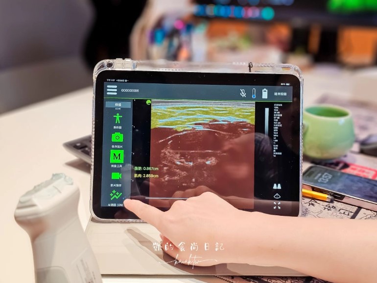 何醫師使用臉部專用超音波來確認下巴的肉肉脂肪厚度。