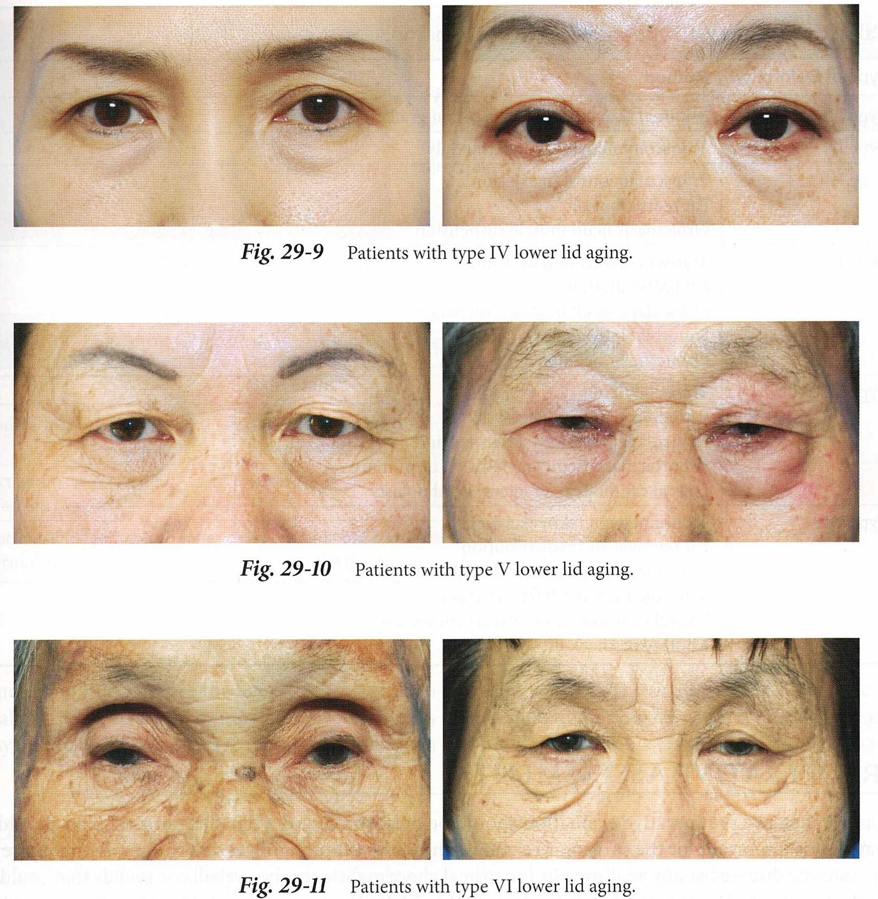 所以眼袋不同嚴重程度可以有分成3-6種, 嚴重程度不同, 個人的恢復體質與先前其他疾病或皮膚厚度等等, 會有不同的做法.(下圖可見眼袋嚴重程度從輕微到嚴重影響外貌)